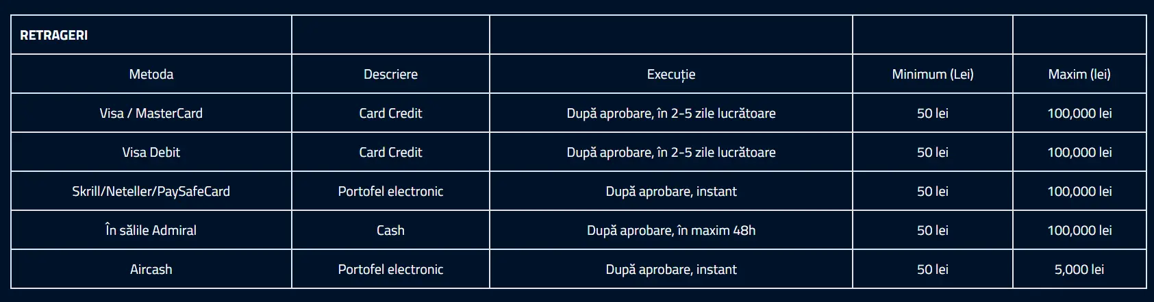 În 2025, AdmiralBet oferă jucătorilor multiple metode sigure și rapide pentru depuneri și retrageri. Poți utiliza carduri bancare (Visa, Mastercard), portofele electronice populare, transferuri bancare sau servicii online de plată de încredere. Toate tranzacțiile sunt protejate prin tehnologii avansate de criptare și respectă reglementările ONJN.
